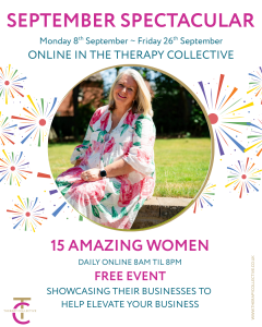 Delighted to be hosting 15 amazing women in the September Spectacular, we start Monday 8th September. Join me live in the Therapy Collective facebook group to hear more